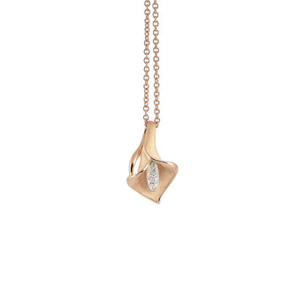 Ispirato alla purezza della calla, simbolo di raffinatezza e bellezza essenziale, il Pendente della Serie Calla è realizzato in esclusivo Oro Orange Apricot 18Kt, una tonalità calda e originale che dona al gioiello un carattere unico e sofisticato.