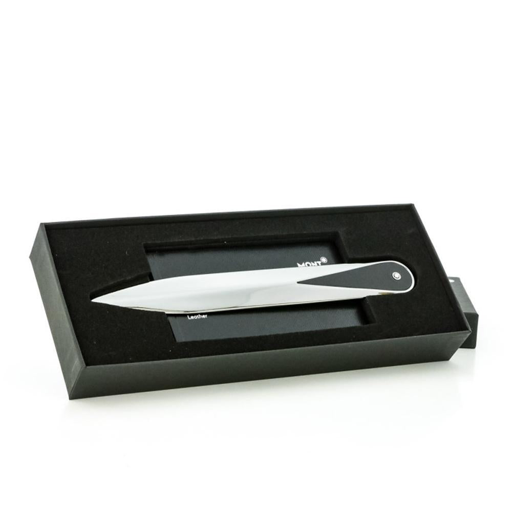 Tagliacarte Montblanc in metallo finitura rutenio e un inserto di morbida pelle di vitello nera. per tutti gli strumenti da ufficio montblanc vengono utilizzati materiali di qualità eccellente, lavorati da artigiani esperti che donano una lavorazione elegante e raffinata.