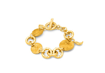 Eleganza artigianale e carattere deciso si incontrano in questo bracciale a maglia tonda in bronzo dorato 18 kt, realizzato con la preziosa tecnica della fusione a cera persa. La finitura martellata, luminosa e irregolare, valorizza i riflessi caldi del metallo, mentre gli eleganti dischi decorativi e l'originale dettaglio ad artiglio aggiungono un tocco distintivo e contemporaneo. La chiusura a T-bar completa il design con praticità ed estetica ricercata.