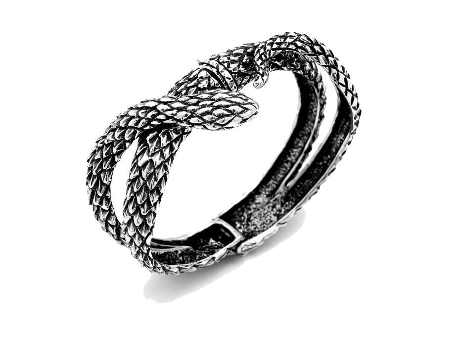 Bracciale Giovanni Raspini, referenza 11260, realizzato in argento 925. Nel bangle Serpente Grande, il tema stilistico animalier viene interpretato con mirabile capacità plastica, realizzando un gioiello complesso ed articolato. Texture di argento brunito che avvolgono il corpo, con scaglie lucenti di serpente. Il bracciale monta una chiusura funzionale e quasi invisibile.