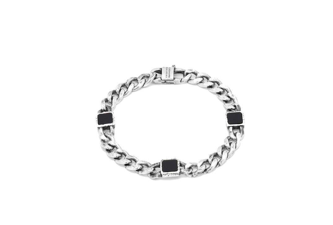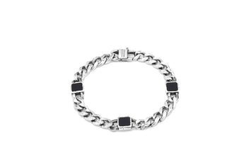 Una catena classica reinterpretata con carattere moderno. Questo bracciale in argento 925 è impreziosito da elementi in onice nera, pietra dal fascino profondo e deciso, che dona un tocco di eleganza discreta ma distintiva.