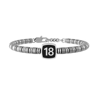 Bracciale in acciaio satinato con cilindri rigati alternati ad anelli e piastra satinata quadrata di colore nero.