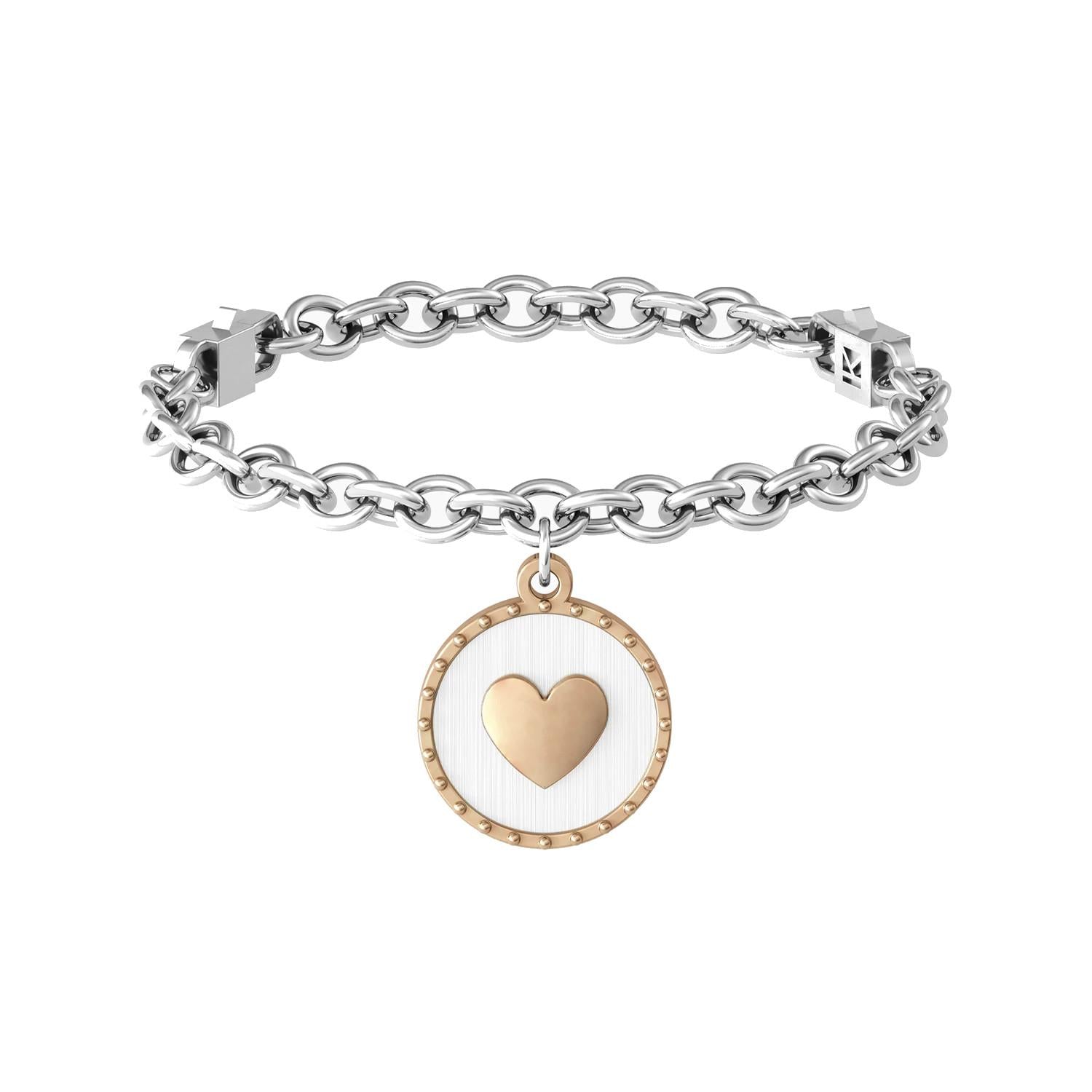 Bracciale in acciaio con catena rolò "comfort fit" e ciondolo satinato tondo con rifinitura borchiata e cuore in rilievo color oro rosa.