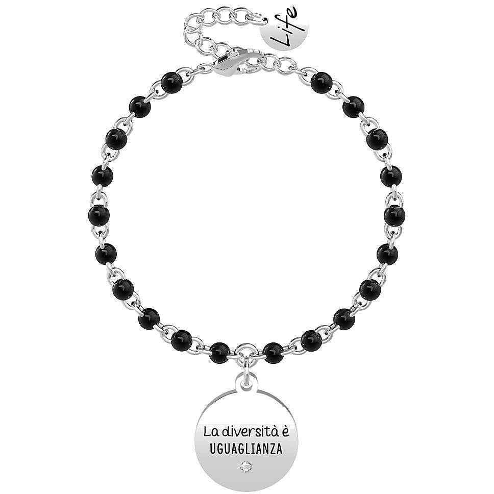 Bracciale da donna Kidult della linea Philosophy, realizzato in acciaio inossidabile con pietre nere e pendente a medaglia con incisione a smalto. La frase è (La Diversità È Bellezza, La Diversità È Unione,La Diversità È Ricchezza, La Diversità È Uguaglianza).