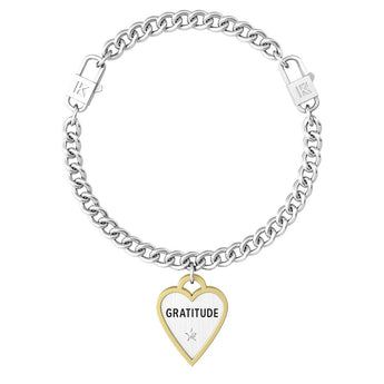Bracciale groumette in acciaio 316L con ciondolo cuore allungato in acciaio satinato con bordo in pvd giallo lucido, cristallo, lunghezza cm 19 Scritta: GRATITUDE Dimensioni: catena 5.8x4.3 mm cuore 15.5x20 mm cristallo bianco Ø 1.50 mm