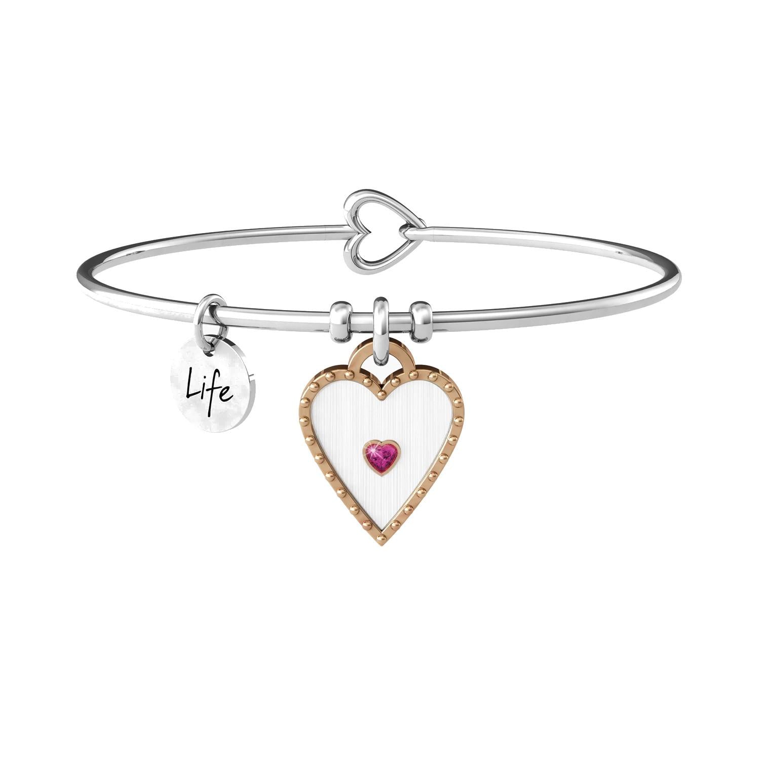 Bangle in acciaio con ciondolo satinato a cuore allungato con rifinitura borchiata color oro rosa e rubino sintetico a cuore.