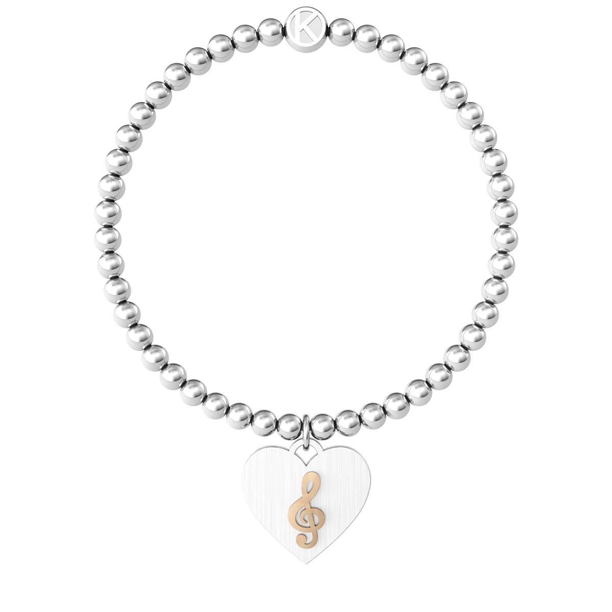 Bracciale elastico in acciaio 316L con sfere e ciondolo cuore satinato, nota musicale in pvd rosa lucido e retro in pvd gun metal, lunghezza cm 17. Scritta: MUSIC Dimensioni: sfera Ø 4 mm cuore 19x18 mm