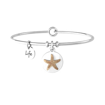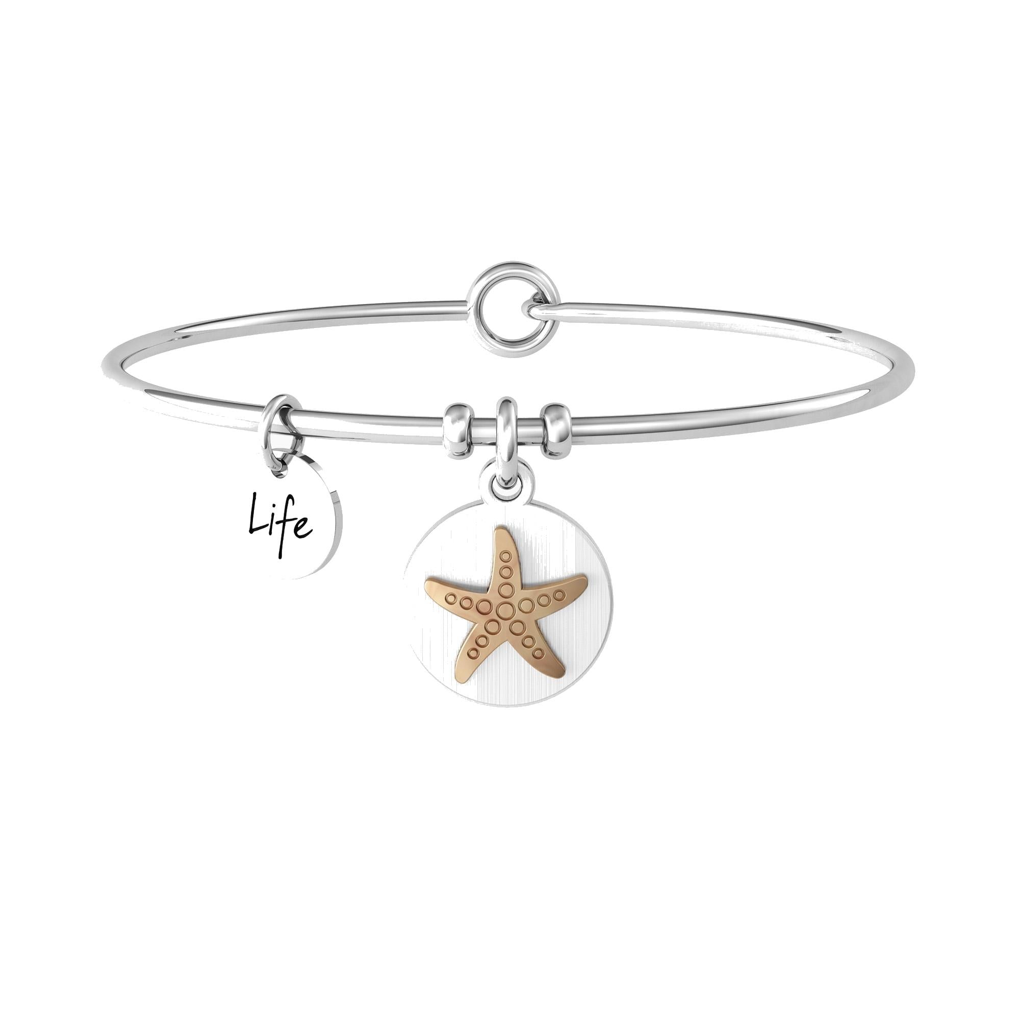 Bangle in acciaio con ciondolo tondo satinato con stella marina rosé lucida, cristallo e scritta "Luck and fortune".