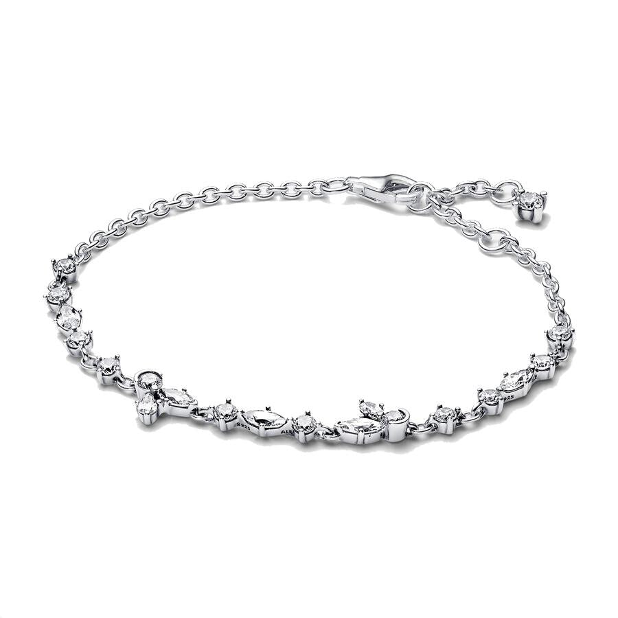 Bracciale Herbarium Petali e Pietre Luminose. Ispirato ai fiori e alle foglie pressate, il bracciale in Argento Sterling 925 rifinito a mano è decorato da pietre di zirconia cubica che alternano forme rotonde e marquise lungo metà catena, con due composizioni di pietre rotonde, a marquise e a pera che creano forme ispirate alla natura.