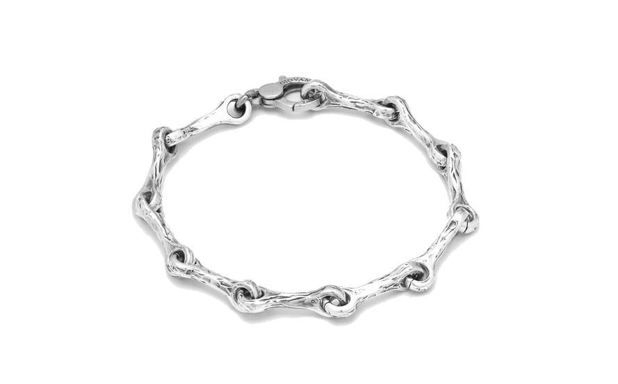 Bracciale Raspini da uomo collezione Alec, realizzato in argento 925 brunito viene realizzato con l'antica tecnica della fusione a cera persa. La lunghezza è 18,5 Cm. La chiusura è a moschettone.