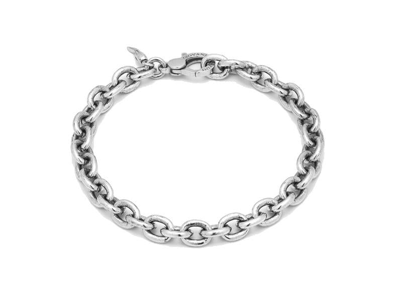Bracciale Raspini catena ovale, realizzata in argento 925 con lavorazione lucida e brunita. La lunghezza è di 19Cm. Chiusura a moschettone.