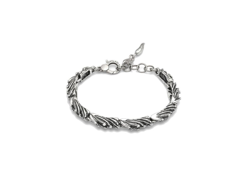 Un bracciale in argento dal design affascinante caratterizzato da un mix di chiaroscuro e lucentezza. Il contrasto tra l'argento brunito e le parti luminose, scolpite a taglio vivo, da vita ad un gioiello intrigante e di classe che evoca il fascino misterioso della Luna. Fatto a mano in azienda.