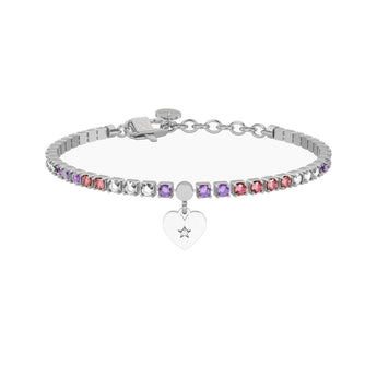 Bracciale da donna regolabile in acciaio con tennis di cristalli multicolor e ciondolo a forma di cuore con cristallo.