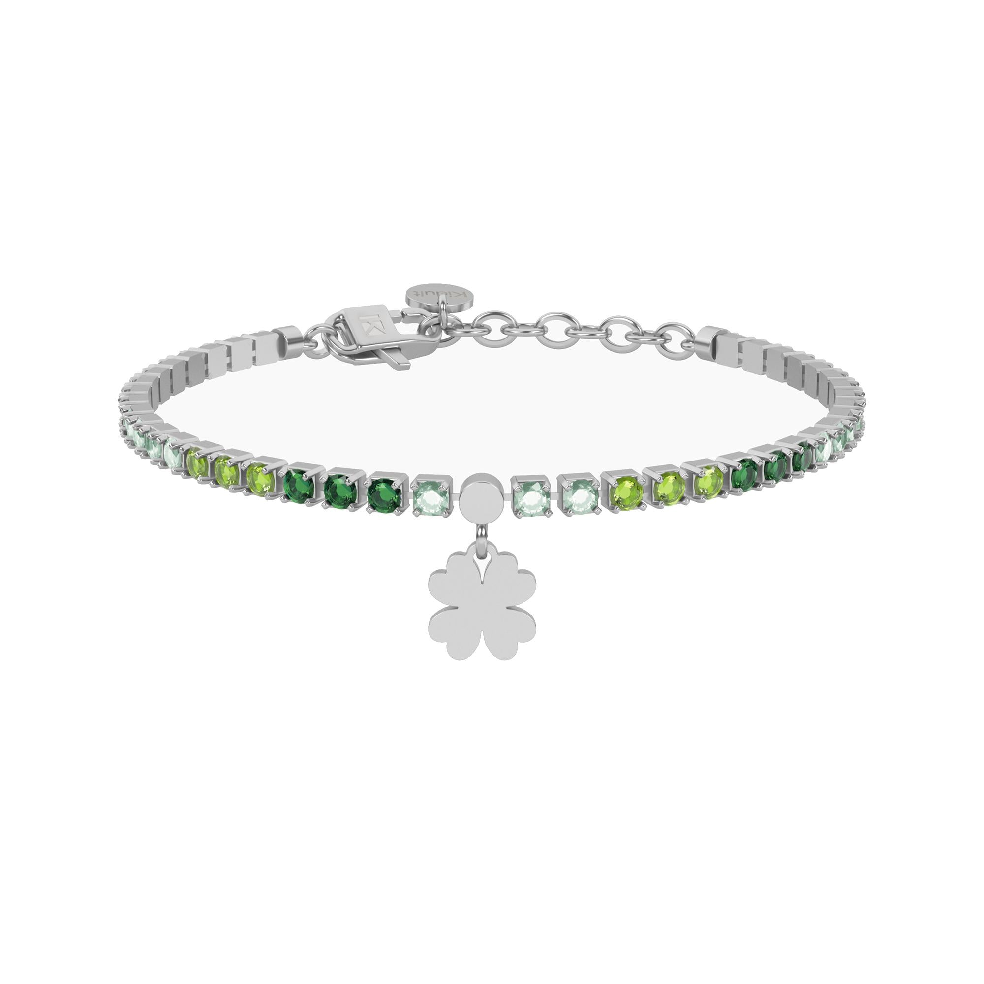 Bracciale da donna regolabile in acciaio con tennis di cristalli multicolor e ciondolo a forma di quadrifoglio.
