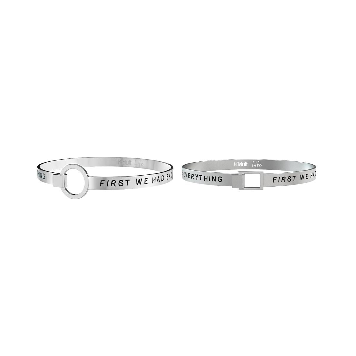 First we had each other, then we had a baby. Now we have everything Set di due bangle in acciaio Lui & Lei. Lei: Bangle in acciaio satinato. • Incisione smaltata • Chiusura tonda • Misura unica, diametro 6 cm • Materiale: Acciaio 316L Lui: Bangle in acciaio satinato. • Incisione smaltata • Chiusura quadrata • Misura Standard, diametri 6,5 cm x 5,2 cm • Materiale: Acciaio 316L • Designed by Kidult in Italy