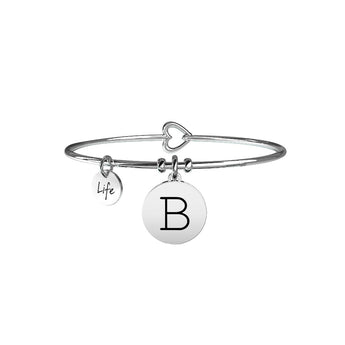 È l'iniziale del tuo nome, di una persona speciale o di qualcuno che ti sta a cuore. La tua lettera preferita, il principio di una parola, una frase, una storia. La vita è un alfabeto di emozioni.Bangle in acciaio con ciondolo tondo con lettera B. • Incisione smaltata sul ciondolo e cristallo sul retro • Chiusura a cuore • Misura unica, diametro 6 cm • Materiale: Acciaio 316L, Cristallo • Designed by Kidult in Italy