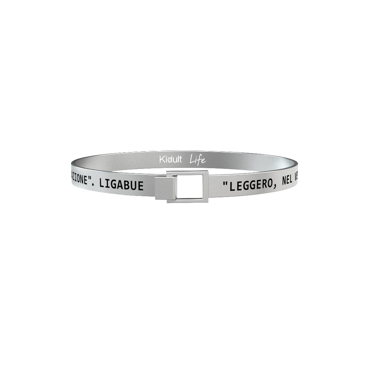 "Leggero, nel vestito migliore, senza andata né ritorno, senza destinazione". LigabueLigabue Official Collection Bangle in acciaio satinato. • Incisione smaltata • Chiusura quadrata • Misura Standard, diametri 6,5 cm x 5,2 cm • Materiale: Acciaio 316L • Designed by Kidult in Italy • Testo e Musica di Luciano Ligabue. © 1995 by Warner Chappell Music Italiana S.r.l. /Fuoritempo S.r.l./ Sugarmusic SpA