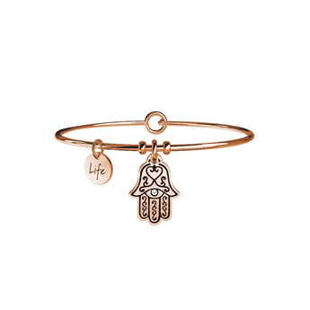 Mano che protegge, custodisce, accarezza. Ovunque tu andrai, questo prezioso amuleto ti porterà fortuna e felicità.Bangle in acciaio color oro rosa con ciondolo Mano di Fatima. • Incisione smaltata e cristallo sul ciondolo • Chiusura tonda • Misura unica, diametro 6 cm • Materiale: Acciaio 316L, Cristallo • Designed by Kidult in Italy