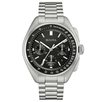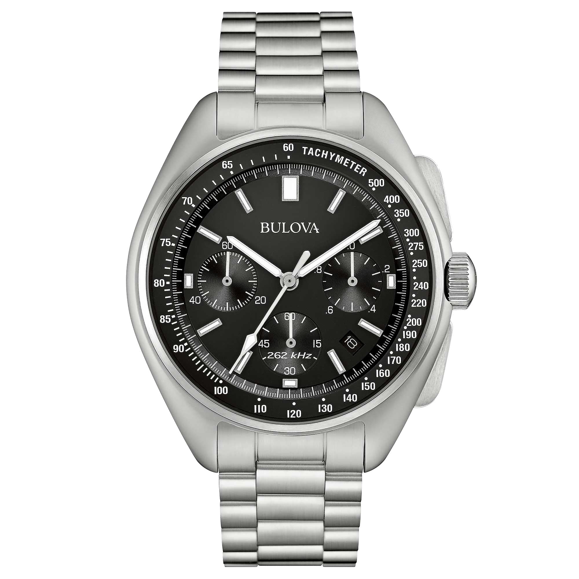 Orologio Bulova da uomo Lunar Pilot, cassa in acciaio inossidabile con un diametro di 45 mm e uno spessore di 13 mm. Quadrante di colore nero con indici bianchi. Vetro in zaffiro antigraffio. Il meccanismo è al quarzo 262 kHz Precisionist con funzione di orario, datario e cronografo. Il bracciale è in acciaio inossidabile con fibbia Deployante. Water Resistant.