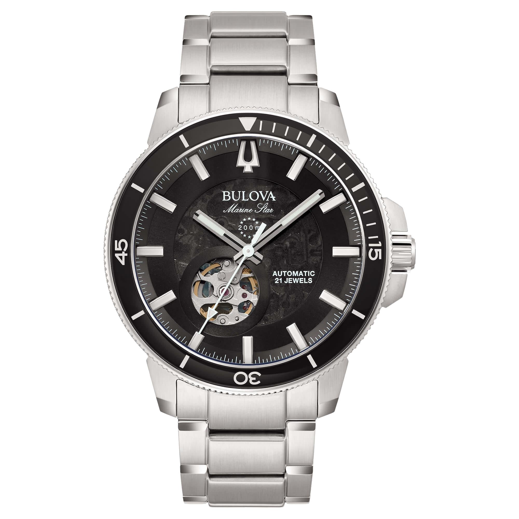 Orologio Bulova da uomo, cassa in acciaio inossidabile con un diametro di 45mm. Il quadrante è colore nero con indici. Meccanismo automatico con funzione di orario. Bracciale in acciaio inossidabile. La resistenza all'acqua è di 20 bar.