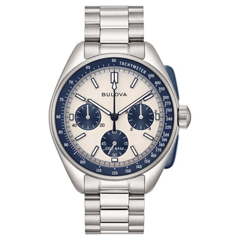 Orologio Bulova Lunar Pilot, cassa in acciaio inossidabile con un diametro di 43mm. Il quadrante è di colore bianco e blu. Il meccanismo è el quarzo ad alta frequenza con funzione di orario e cronografo. Il bracciale è in acciaio inossidabile.
