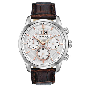 Orologio Bulova da uomo, cassa in acciaio inossidabile con un diametro di 44 mm e uno spessore di 12 mm, il quadrante è di colore silver. Il meccanismo è al quarzo con funzione di orario, datario e cronografo. Il bracciale è in pelle di colore marrone. Il vetro è minerale. Water Resistant.