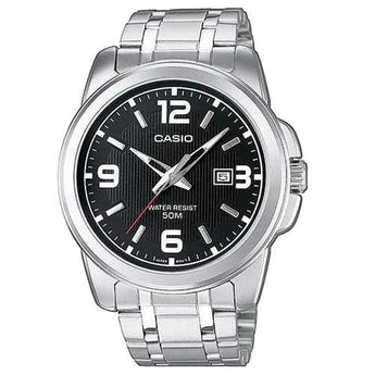 Orologio Casio, referenza MTP-1314PD-1AVEF, cassa in acciaio inossidabile, quadrante nero con indici e numeri arabi applicati. Vetro minerale. Il meccanismo è al quarzo con funzione di orario e datario.