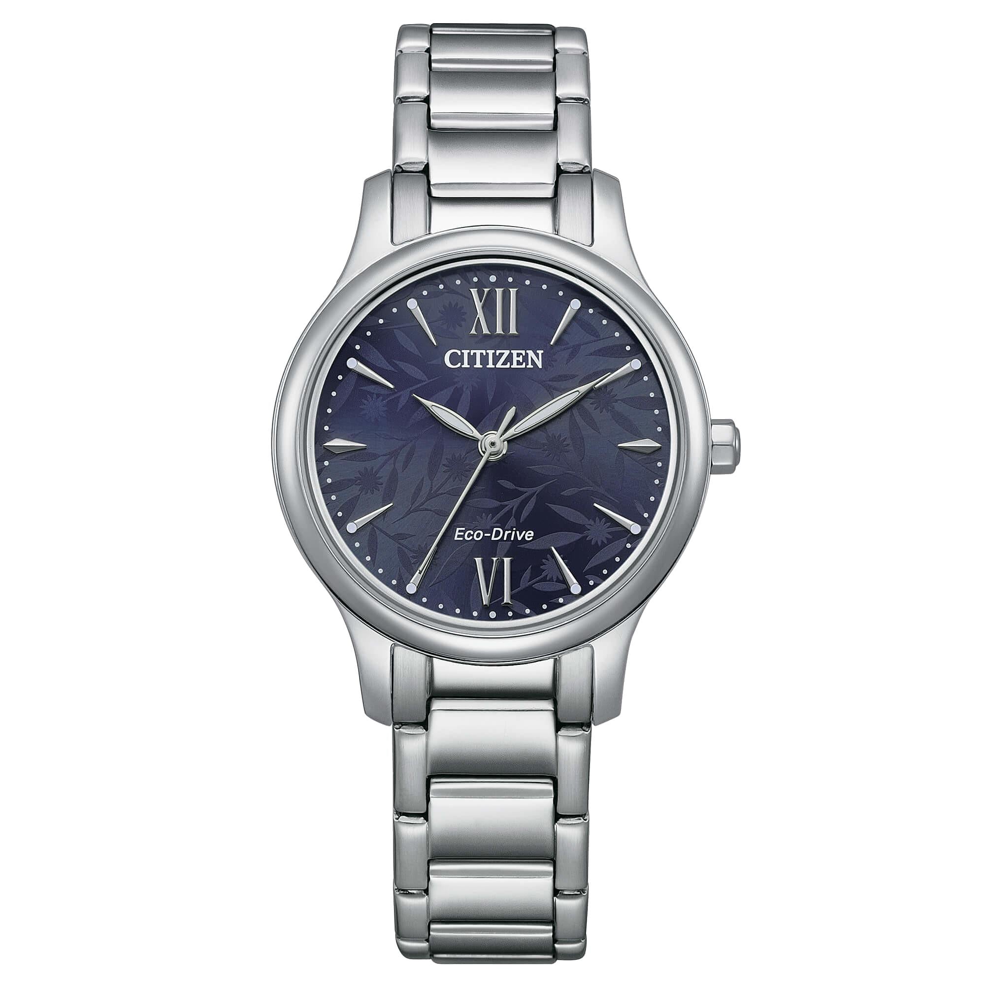 Orologio Citizen da donna. Cassa in acciaio inossidabile con un diametro di 30 mm. Meccanismo al quarzo con funzione di solo tempo. Il quadrante è di colore blu. La resistenza all'acqua è di 3 bar.