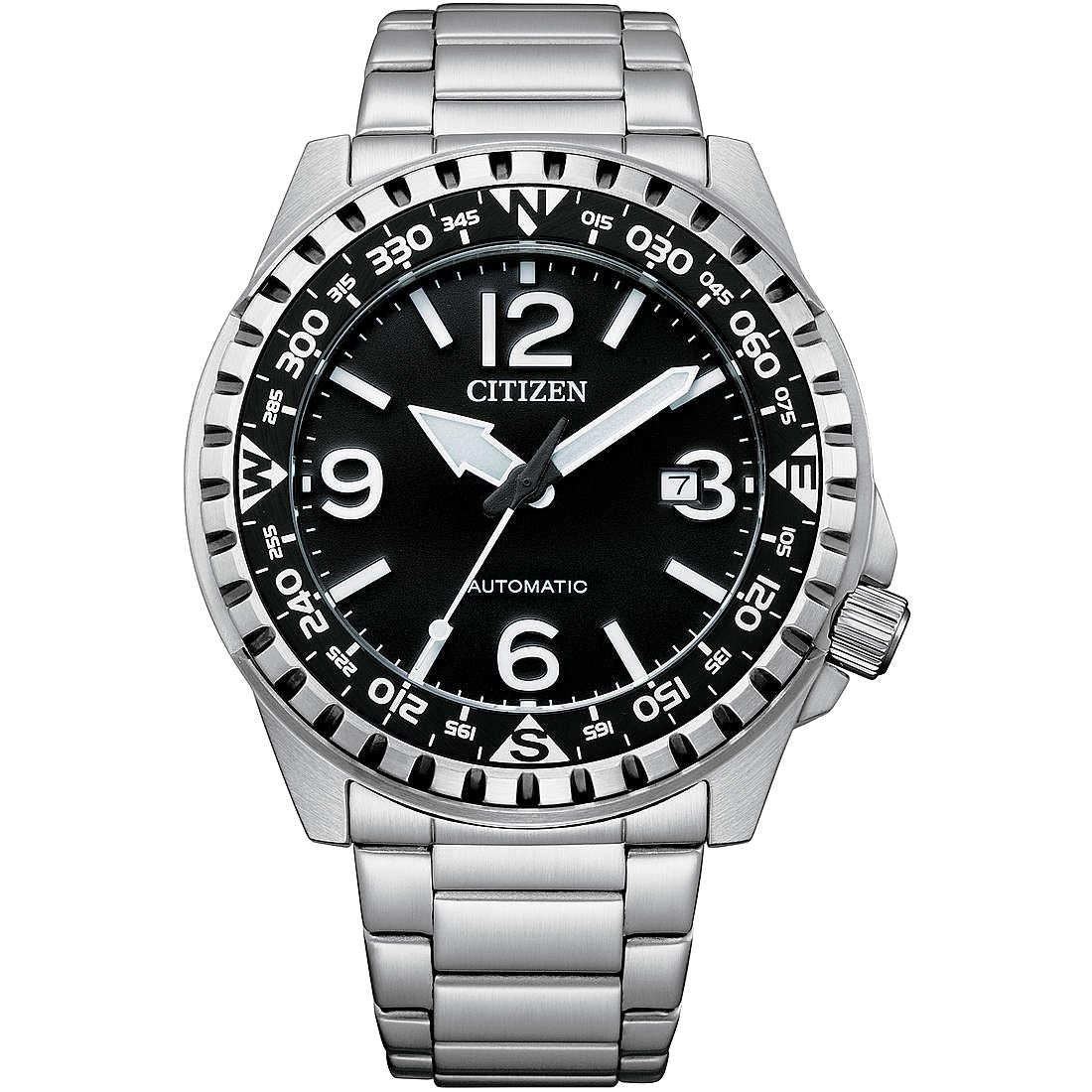 Orologio Citizen da uomo solo tempo della linea Military, referenza NJ2190-85E, cassa e bracciale in acciaio, il quadrante è nero con numeri e lancette di colore bianco luminol, la cassa ha un diametro di 46mm, la resistenza all'acqua è di 10 atm. Il meccanismo è automatico con funzione di solo tempo e datario.