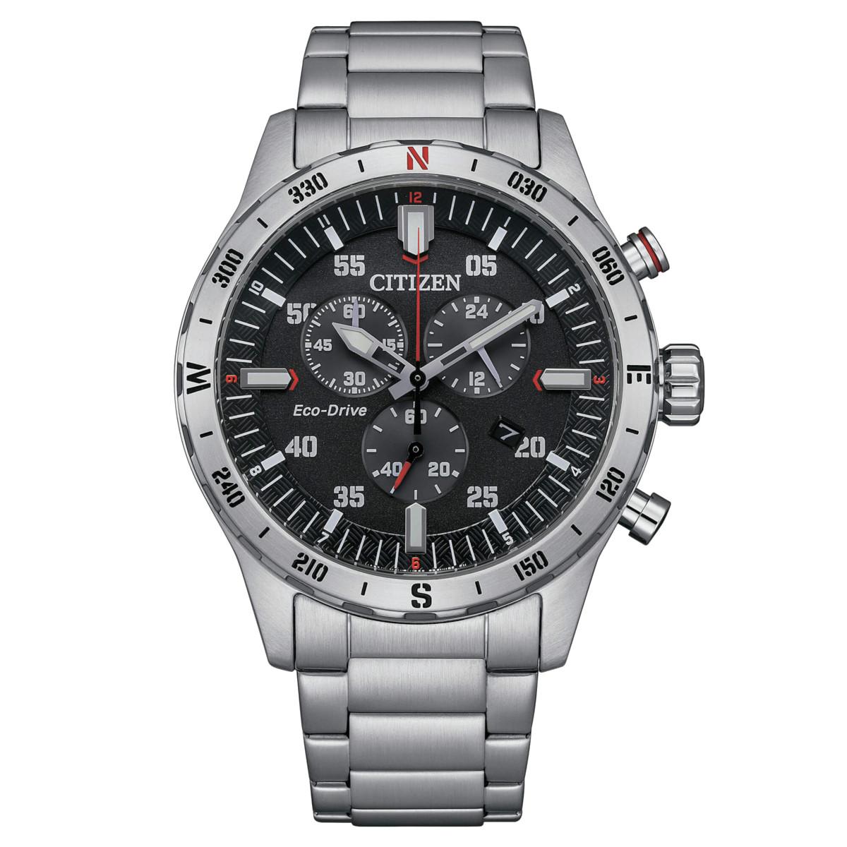Orologio Citizen della collezione outdoor con cassa in acciaio inossidabile del diametro di 43mm, quadrante nero, movimento Eco Drive con funzione di orario, datario, cronografo. Il bracciale è in acciaio inossidabile. La resistenza all'acqua è di 10 bar.