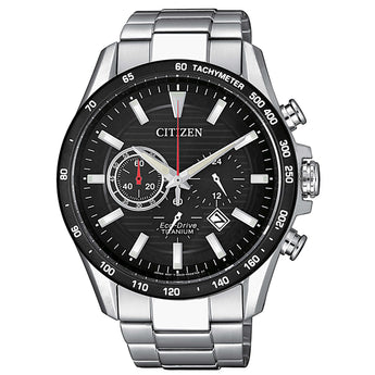 Orologio Citizen da uomo, cassa in supertitanio con un diametro di 43 mm, vetro in zaffiro antigraffio, meccanismo al quarzo con funzione di orario, datario cronografo, indicatore AM/PM, carica solare. Resistenza all'acqua 10 bar.