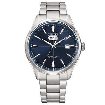 Orologio Citizen da uomo, cassa in acciaio inossidabile con un diametro di 40mm. Vetro minerale, quadrante di colore blu. Meccanismo automatico con funzione di orario e datario. Bracciale in acciaio inossidabile.