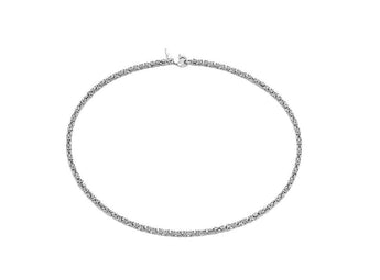 Da sempre best seller del brand, diventa preziosa collana in argento una catena che ha fatto la storia della gioielleria. E' la maglia bizantina in versione mini mini, lavorata artigianalmente, col suo particolarissimo ed elegante intreccio. Un gioiello estremamente versatile che si presta ad un indosso sia maschile che femminile.