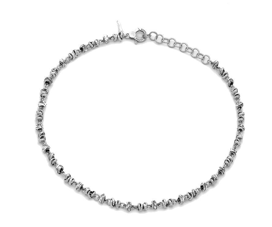 Collana Giovanni Raspini, realizzata in argento 925 con maglie a nodo. Chiusura a moschettone con maglie di regolazione. La lunghezza è di 46 cm.