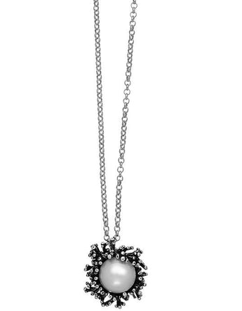 Collana Giovanni Raspini anemone piccola, realizzata in argento 925 brunito e una perla di acqua dolce. La lunghezza della catena è 45 cm con chiusura a moschettone.