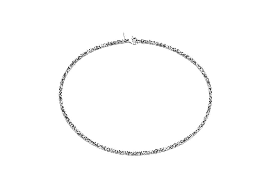 Da sempre best seller del brand, diventa preziosa collana in argento una catena che ha fatto la storia della gioielleria. E' la maglia bizantina in versione mini mini, lavorata artigianalmente, col suo particolarissimo ed elegante intreccio. Un gioiello estremamente versatile che si presta ad un indosso sia maschile che femminile.