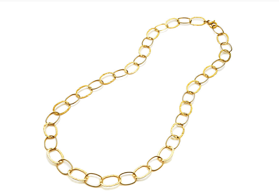 Un design sofisticato che unisce leggerezza, luce e personalità. Questa collana lunga 92 cm è realizzata in argento 925 con bagno d'oro 18 kt e alterna con armonia due tipi di maglie ovali artigianali, creando un ritmo visivo elegante e contemporaneo.