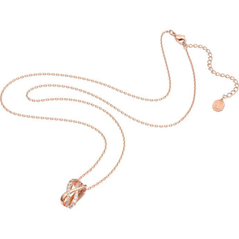 Collana Swarovski collezione Twist placcata oro rosa con cristalli bianchi. Questo pendente elegante e senza tempo sarà un elemento fantastico da inserire nelle mise di ogni giorno. Linee delicatamente curve di metallo placcato oro rosa lucido e file scintillanti di pietre bianche irradiano una luce brillante. Una catenina abbinata con chiusura a moschettone completa il design, che si adatterà perfettamente alla tua collezione.