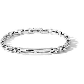 Bracciale in acciaio di Comete Gioielli, referenza UBR578. Il bracciale è fatto a   catena con la piastrina centrale, nel centro della piastra c'è incassato un diamante   naturale della caratura di 0,05Ct.
