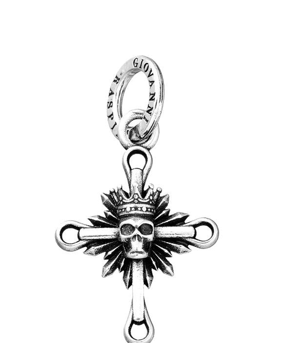Ciondolo Giovanni Raspini charm croce teschio, realizzato in argento 925 con finitura lucida e brunita. L'altezza è di 2,5 cm (esclusa la maglia di 0,9 cm).