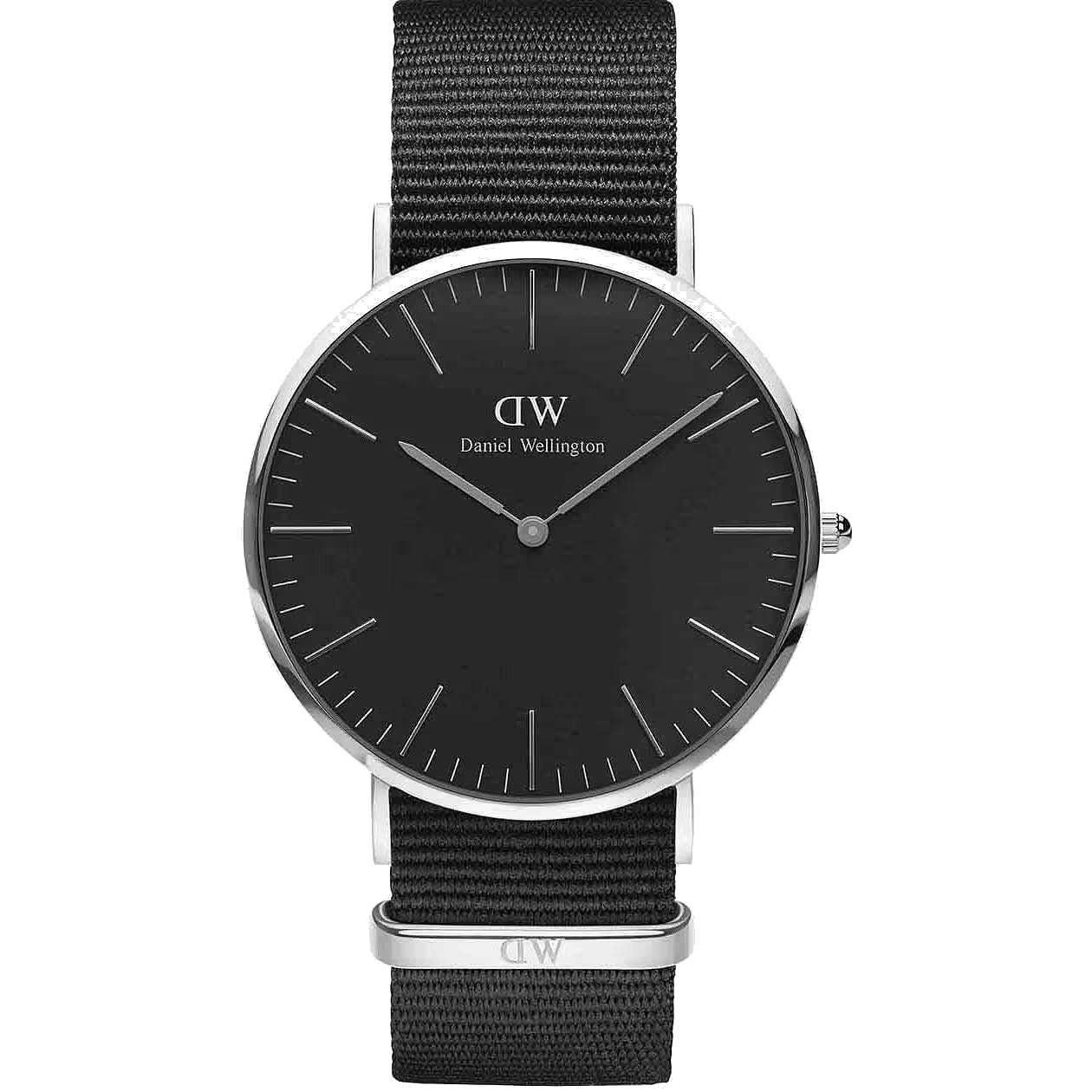 Orologio Daniel Wellington da uomo, cassa in acciaio inossidabile con un diametro di 40 mm, quadrante di colore nero, meccanismo al quarzo con funzione di solo tempo. Cinturino in tessuto nero.