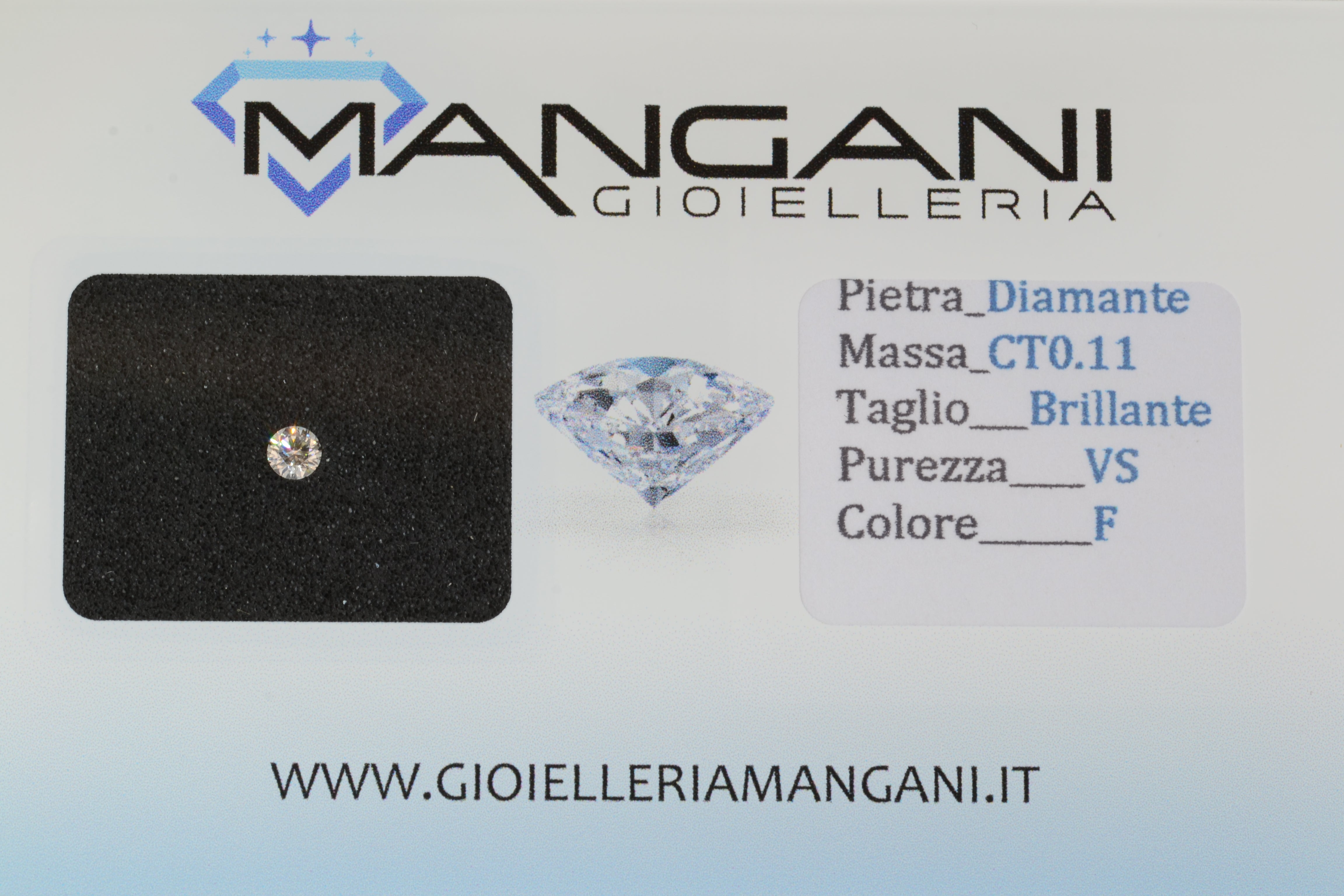 Diamante naturale in blister con una caratura di 0,11 il colore è F e la qualità VS. Il diamante è corredato da garanzia cartacea con le caratteristiche della pietra.