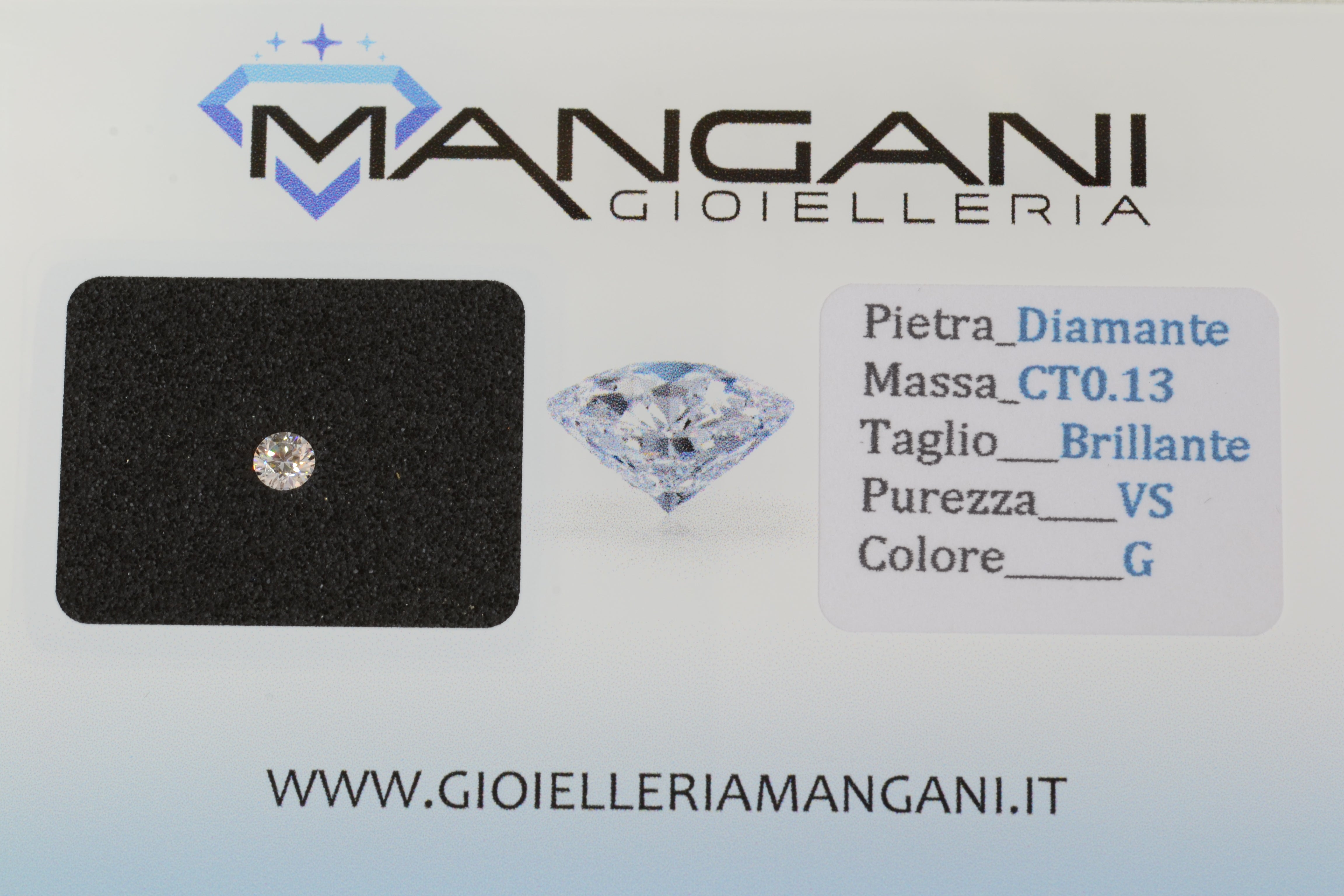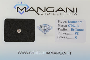 Diamante naturale in blister con una caratura di 0,13 il colore è G e la qualità VS. Il diamante è corredato da garanzia cartacea con le caratteristiche della pietra.