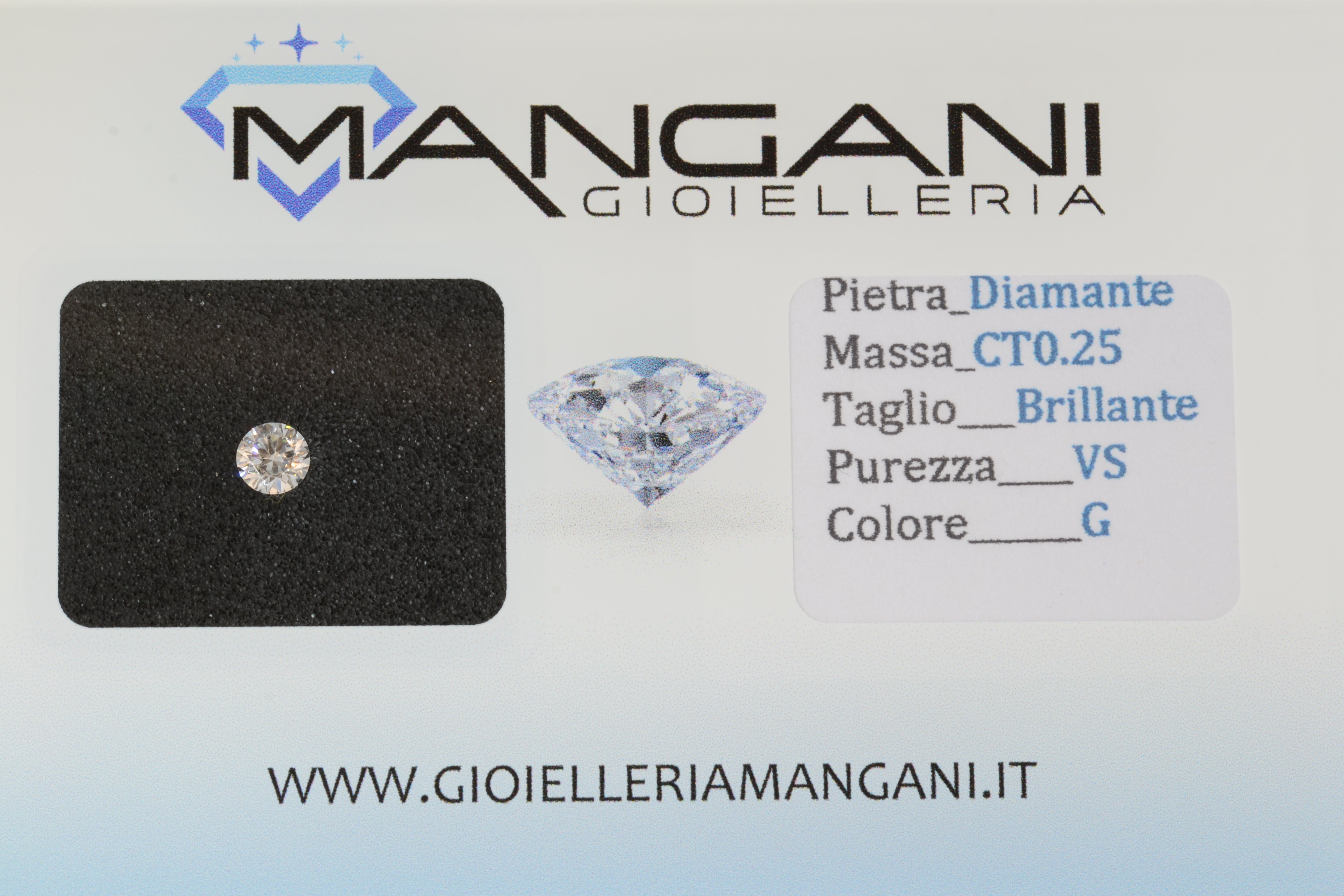 Diamante naturale in blister con una caratura di 0,25 il colore è G e la qualità VS. Il diamante è corredato da garanzia cartacea con le caratteristiche della pietra.