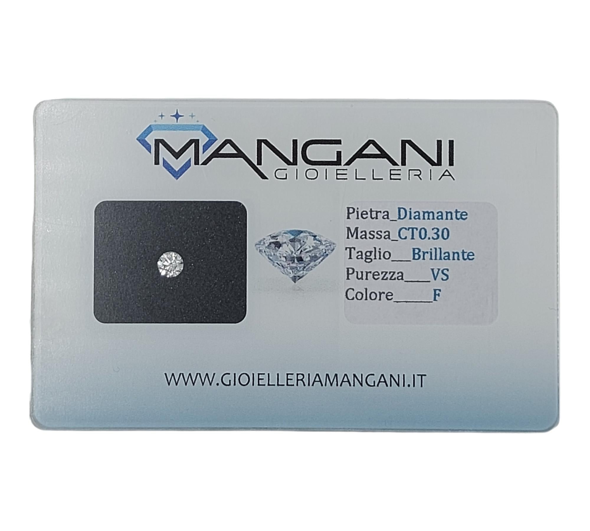 Diamante naturale in blister con una caratura di 0,30 il colore è F e la qualità VS. Il diamante è corredato da garanzia cartacea con le caratteristiche della pietra.