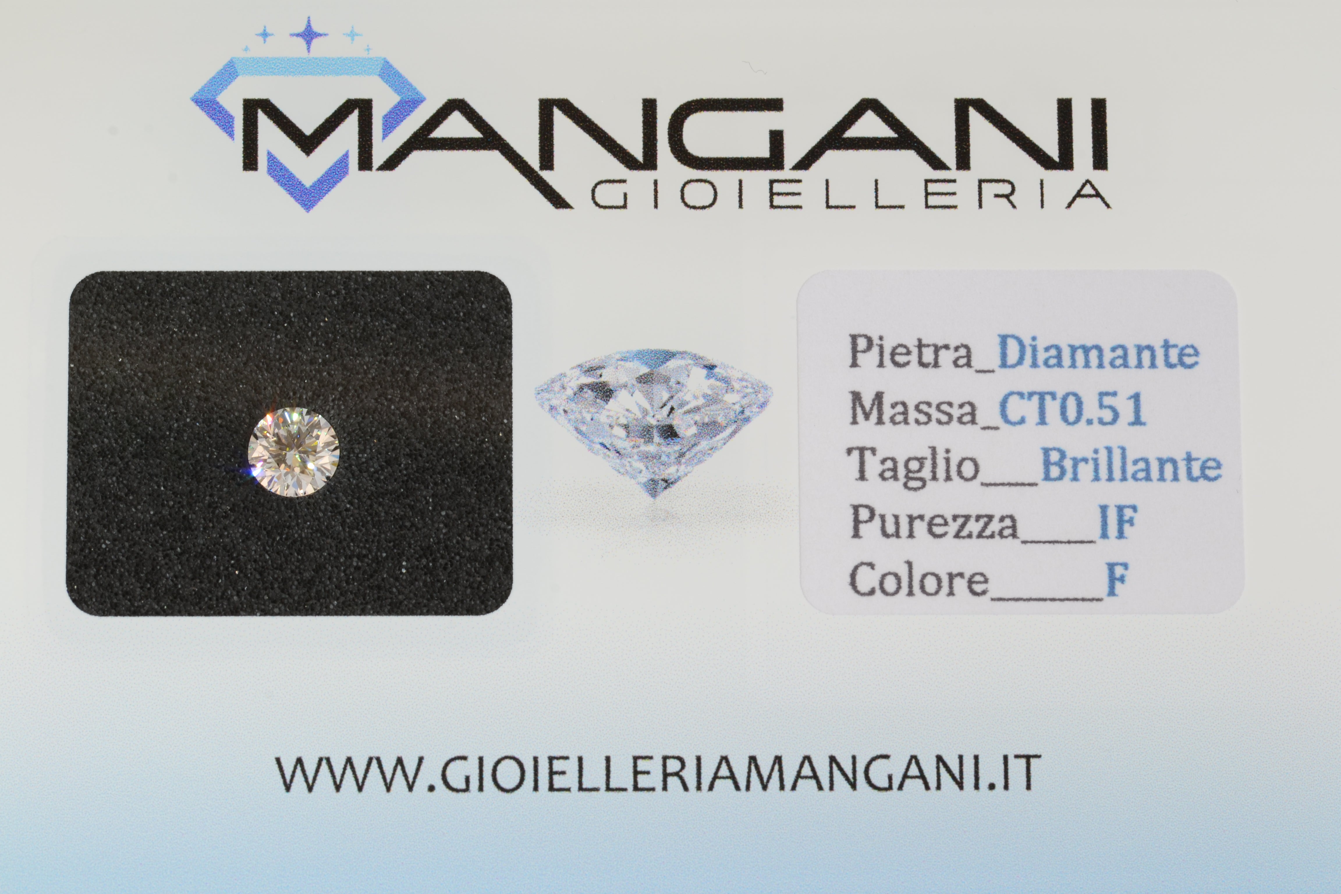 Diamante naturale in blister con una caratura di 0,51 il colore è F e la qualità IF. Il diamante è corredato da garanzia cartacea con le caratteristiche della pietra e certificato di autenticità GIA.