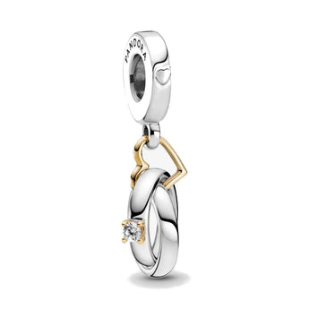 Charm Pandora pendente Fedi bicolore. Il charm in argento presenta un profilo a forma di cuore in Oro 14K con due anelli intrecciati, un solitario in Argento Sterling 925 con una pietra scintillante inserita in un’incastonatura in Oro 14K e un anello a fascia in Argento Sterling 925. Entrambi recano all’interno i messaggi incisi “You and I” “ “Forever and always”. Il gancio include l’iconico logo Pandora e due cuori in rilievo.