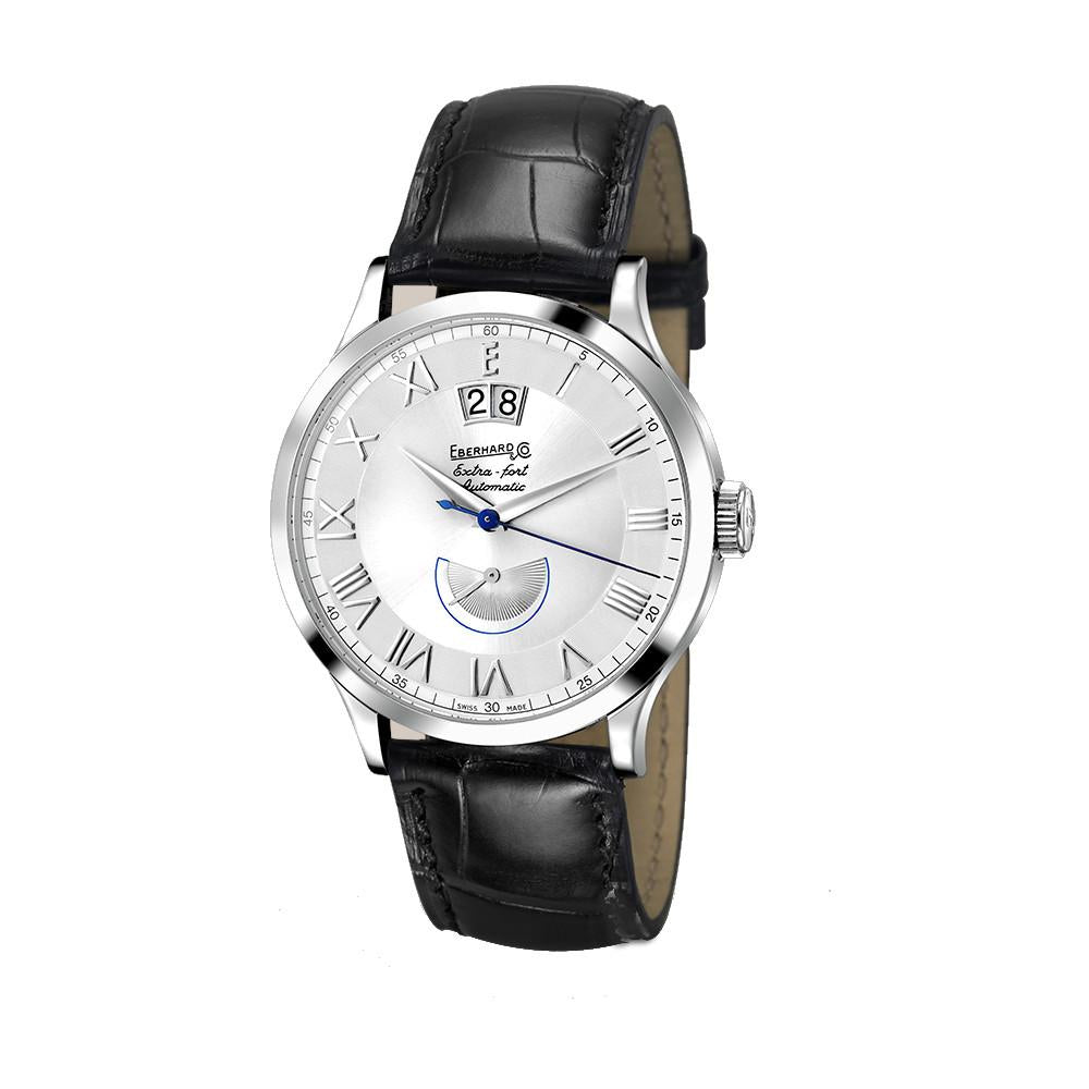 Orologio Eberhard Extra Fort, cassa in acciaio inossidabile con un diametro di 39mm, quadrante colore argento, vetro in zaffiro antigraffio bombato con trattamento antiriflesso. Il meccanismo è automatico Swiss Made con funzione di Orario, datario e riserva di carica. Il cinturino è in coccodrillo con fibbia ad ardiglione. La resistenza all'acqua è 5 bar.