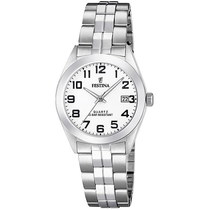 Orologio Festina, referenza F20438/1, cassa in acciaio inossidabile di forma rotonda con un diamtro di 28 mm. Il vetro è minerale. Il quadrante è di colore bianco con numeri arabi dipinti. Il meccanismo è al quarzo con funzione di solo tempo. Il bracciale è in acciaio inossidabile 316l. La resistenza all'acqua è di 10 Atm.