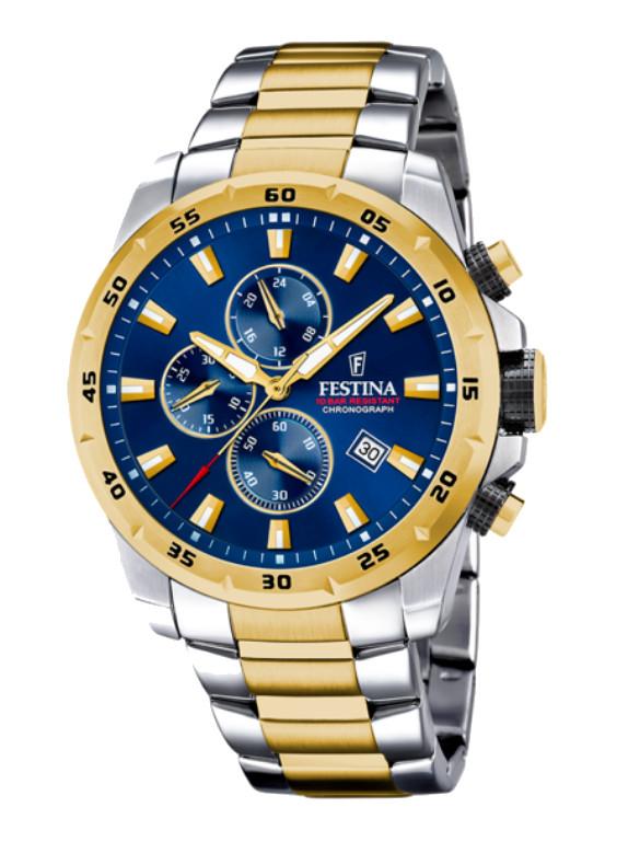 Orologio Festina, referenza F20562/2, cassa in acciaio inossidabile di forma rotonda con un diametro di 45 mm e uno spessore di 12,4 mm. Il vetro è minerale. Il quadrante è di colore blu con indici applicati di colore oro. Il movimento è al quarzo con funzione di tempo, datario e cronografo. Il bracciale è in acciaio inossidabile 316l con laminatura mista acciaio e oro.